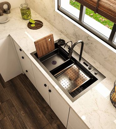 Well, depending on the job and design, we may use fancy or regular accessories. For example, for a modern push to open kitchen design, we put touch to open fully automated accessories for the upper cabinets.
